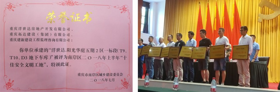 2018年7月17日,經(jīng)南岸區(qū)建委嚴(yán)格評選,洋世達(dá)·南濱特區(qū)(陽光華庭五期)二區(qū)一標(biāo)段項目(T9、T10、D3地下車庫)榮獲南岸區(qū)2018年度上半年“十佳安全文明工地”的榮譽稱號。