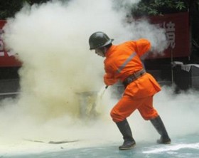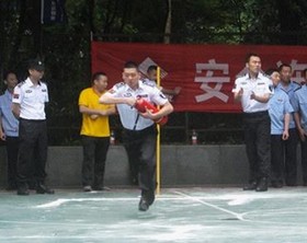 現場比賽共分為4個環節,第一個環節為軍事列隊展示,要求場上的護衛方陣軍容整齊,軍姿嚴謹,英姿颯爽,每個人的動作要求協調一致,抬手、頓足、轉向都流暢自然。第二個環節為滅火器4X50米接力,不僅是速度與毅力的考驗,更是要檢驗隊員之間的配合是否默契。第三個環節為50米液體滅火,賽場上設置兩個火盆,并模擬著火現場,護衛隊員們需第一時間趕赴火盆處,用滅火器等消防器材進行滅火作業,該環節不僅模擬真實,更極具觀賞性和刺激性。最后一個環節為消防出水操,隊員們被要求在較短的時間內,快速沖鋒奔襲、配合拋擲水帶等動作,這要求隊員們必須臨危不亂、準確反映和協調合作。
